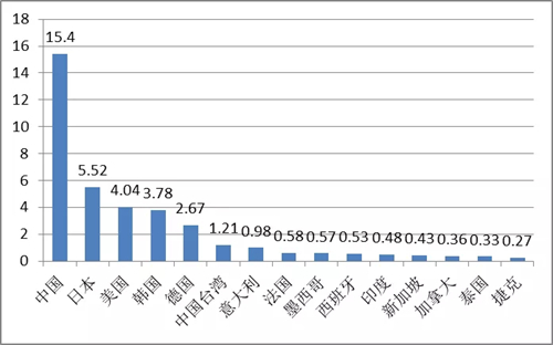 圖2 2018年工業機器人銷量排名前15市場(單位:萬臺),資料來源:ifr,中國電子學會整理